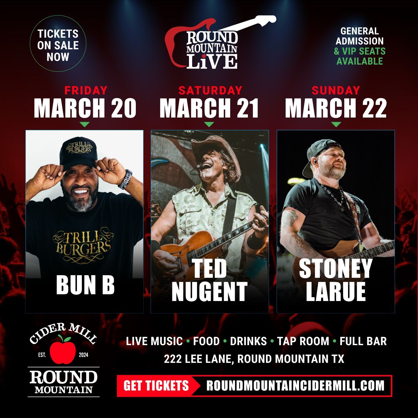 HILL COUNTRY SPRING JAM | Mar 20-22 | Round Mountain Cider Mill | Various pricing | Info