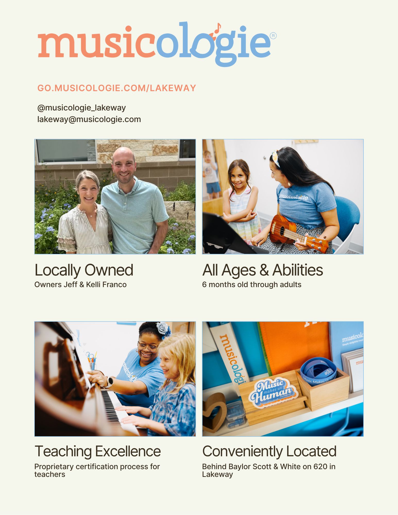 Inspired by Purpose. Meet Musicologie, a new music school owned by parents who understand that learning an instrument is about more than just notes on a page. Owners Jeff and Kelli Franco (and parents of two daughters) wanted to create a place where children can grow confidence, creativity, and connection through the joy of music.